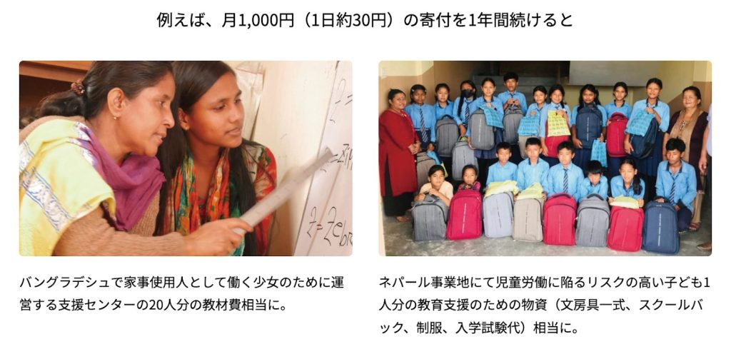 しかし、「女の子にフォーカスして支援したい」という方には、「女の子たちをリスクから守ると同時に、自立していくためのプロジェクトを実施」するという「ガールズ・プロジェクト」(毎月1,000円〜)寄付が合っているように思えました。