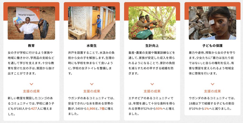 ワールド・ビジョン・ジャパン | ① 女の子が教育や結婚、将来を「自分で選べる社会」を目指す活動を行う。 ② チャイルド・スポンサーシップを通じて、支援者が1対1で子どもの成長を見守れる仕組み。 |
